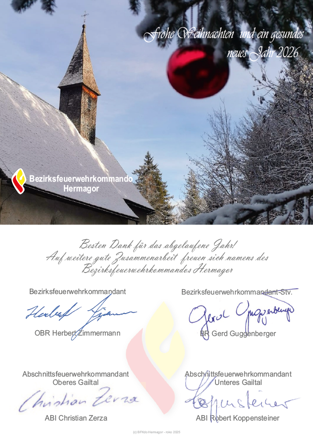 Das Bezirksfeuerwehrkommando Hermagor wünscht frohe und besinnliche Weihnachten sowie einen guten Rutsch ins neue Jahr 2026.