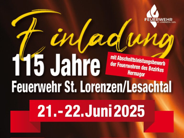 Anlässlich der 115-Jahr-Feier lädt die Feuerwehr St. Lorenzen/Lesachtal zum 1. Abschnittsleistungsbewerb am 21. Juni 2025 mit dem Beginn um 14:30 Uhr am Bewerbsplatz beim Bildungszentrum Lesachtal ein.