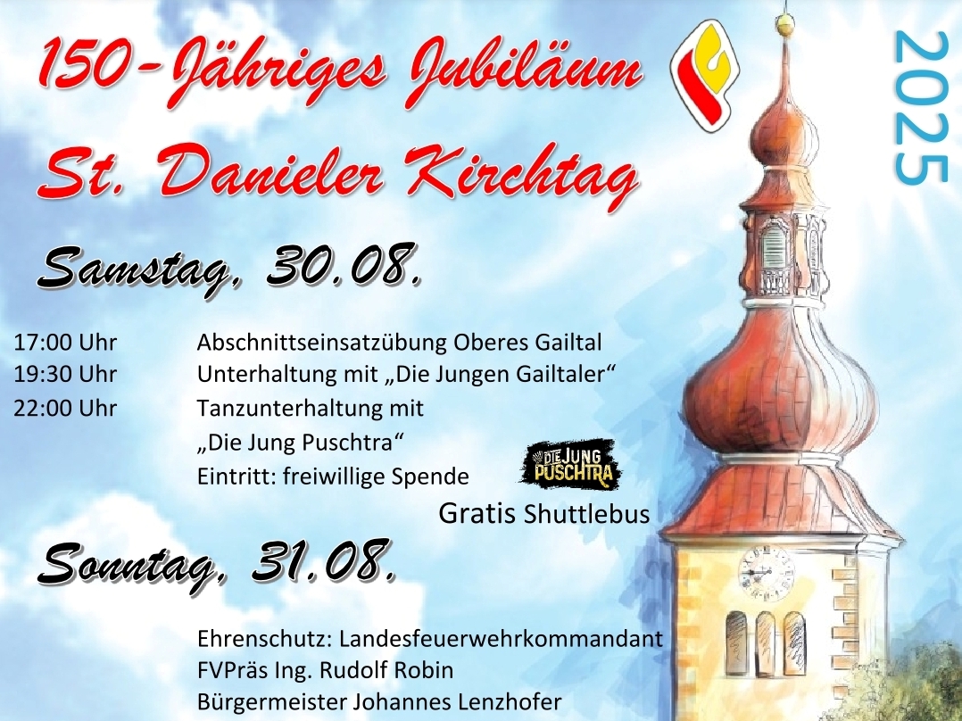Die FF St. Daniel lädt am 30. und 31. August 2025 zu ihrem 150-jährigem Jubiläum und zum St. Danieler Kirchtag mit Abschnittsübung und Tanzunterhaltung am Samstag sowie Festmesse mit Festakt und Frühschoppen am Sonntag ein.