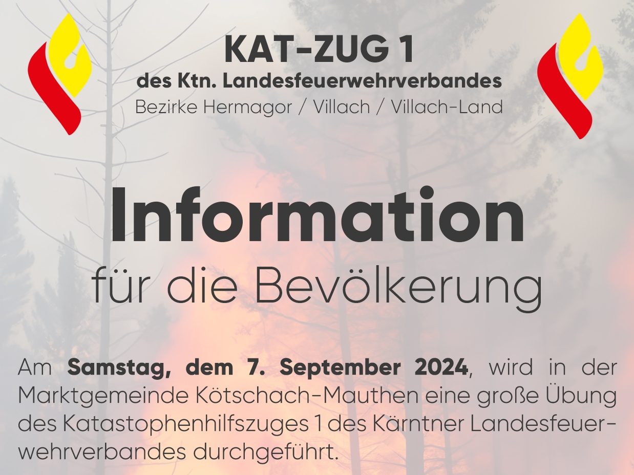 Am Samstag, dem 7. September 2024, wird in der Marktgemeinde Kötschach-Mauthen eine große Übung des Katastophenhilfszuges 1 des Kärntner Landesfeuerwehrverbandes durchgeführt.